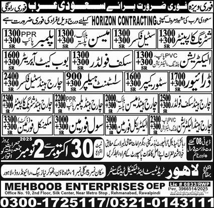 Apply for multiple skilled and unskilled positions with Mehboob Enterprises Overseas Employment Promoters for Riyadh,…