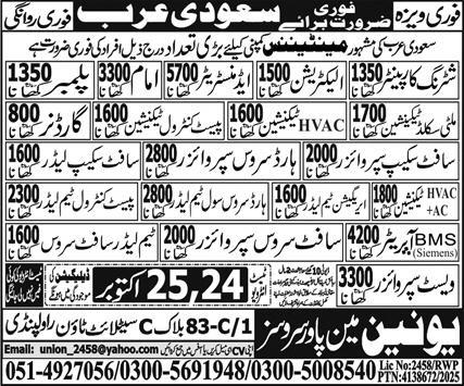 Union Manpower Services seeks skilled and semi-skilled workers for multiple maintenance and service roles in…