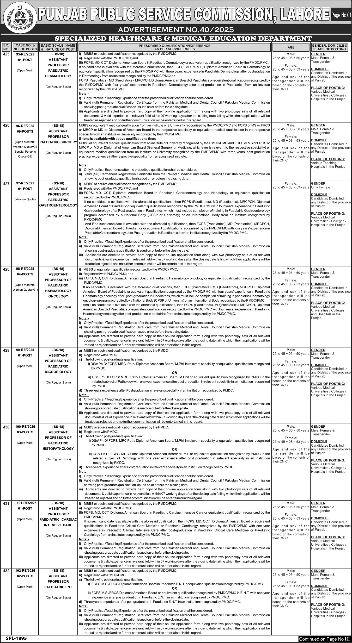 Apply for multiple specialist and administrative positions announced in PPSC Advertisement No.40/2025 (posted 23 Oct…