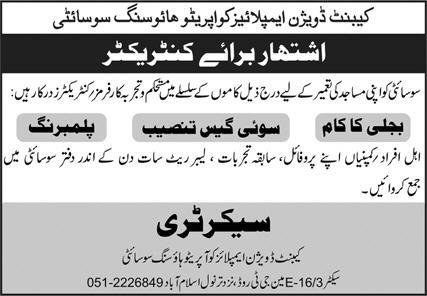 Apply for contractor positions (Electrical, Gas Installation, Plumbing) at Cabinet Division Employees Cooperative Housing Society,…