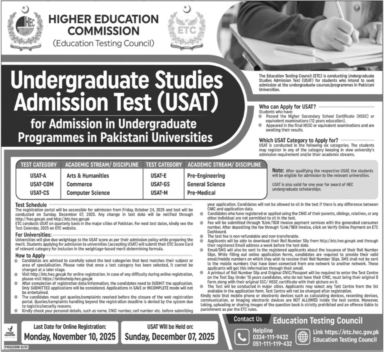 Apply for HEC Undergraduate Studies Admission Test (USAT) 2025 — registration open for students with…