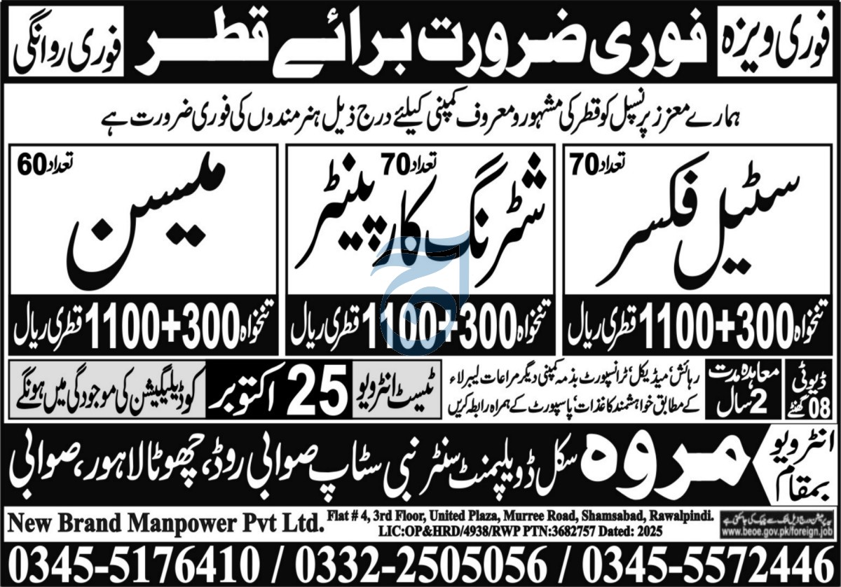 Apply for New Brand Manpower Qatar Jobs 2025 — Steel Fixer, Mason, Shuttering Carpenter. Jobs…