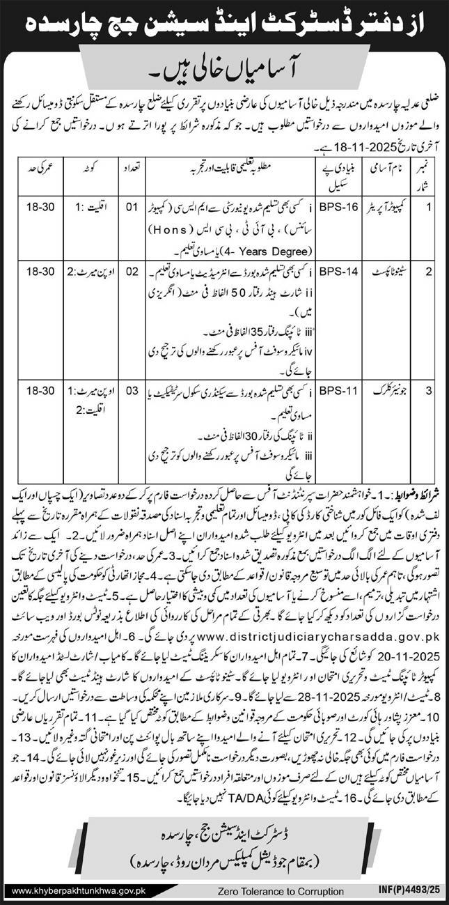Apply for District & Session Court Charsadda Jobs 2025. Vacancies for Computer Operator (BPS-16), Stenotypist…