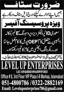 Apply for Visa Processing Officer at Level Up Enterprises Islamabad (I-8 Markaz). Walk-in interview, Intermediate/Bachelor…