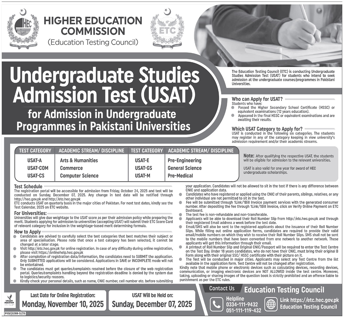 Apply for HEC Undergraduate Studies Admission Test (USAT) 2025 in Islamabad. Eligible students with Intermediate…