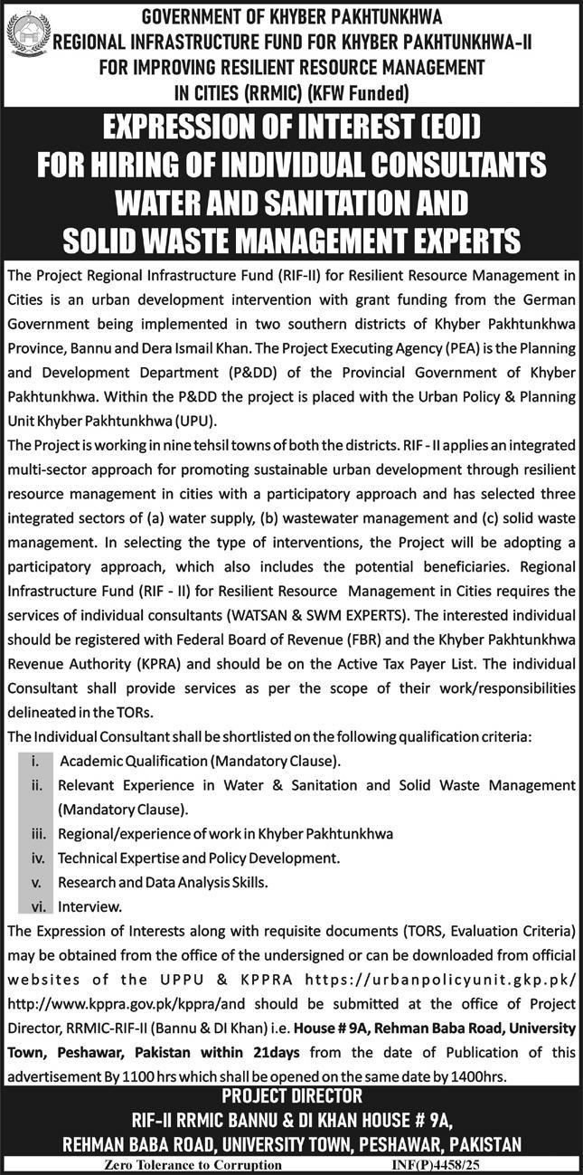 Planning & Development Department KP invites EOIs for Water, Sanitation and Solid Waste Management Consultants…