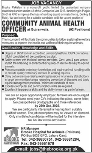 Apply for Community Animal Health Officer positions at Brooke Pakistan (posted 22 Oct 2025). DVM…