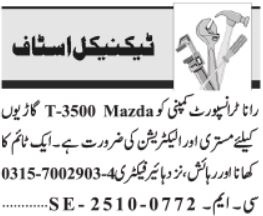 Rana Transport Company Lahore is hiring Electricians and Mistris for T-3500 Mazda vehicles. Apply by…
