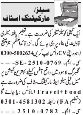Marketing Company (Gulberg, Lahore) is hiring Sales Manager, Marketing Staff and Telesales Staff. Apply by…