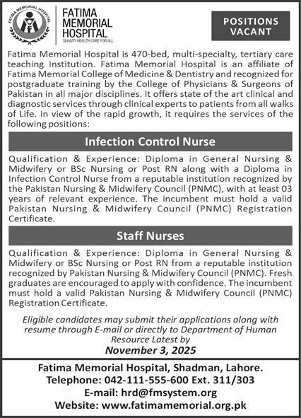 Apply for Nursing opportunities at Fatima Memorial Hospital Lahore (2025). Positions: Infection Control Nurse, Staff…