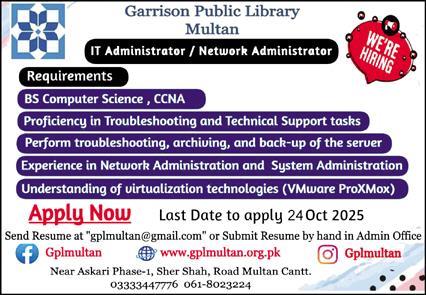 Apply by 24 Oct 2025 for IT Administrator / Network Administrator at Garrison Public Library…