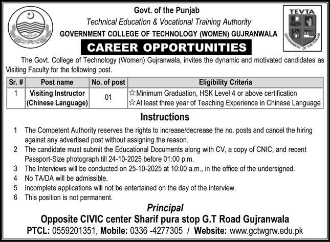 Apply for Visiting Instructor (Chinese Language) at Government College of Technology (Women), Gujranwala — TEVTA.…