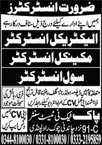 Apply for Mechanical, Civil and Electrical Instructor positions at Pak Techni Test Center, Chandni Chowk,…