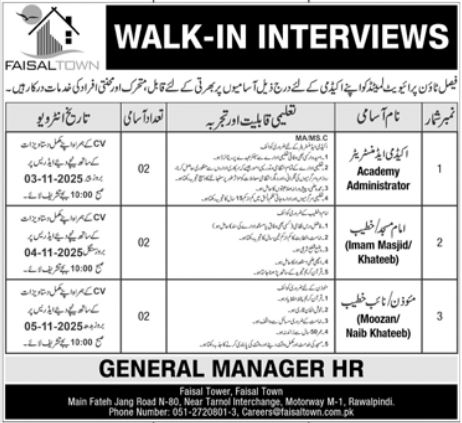 Apply for Faisal Town Private Limited walk-in interviews (Academy Administrator, Imam/Khateeb, Moozan/Naib Khateeb) in Islamabad/Rawalpindi.…