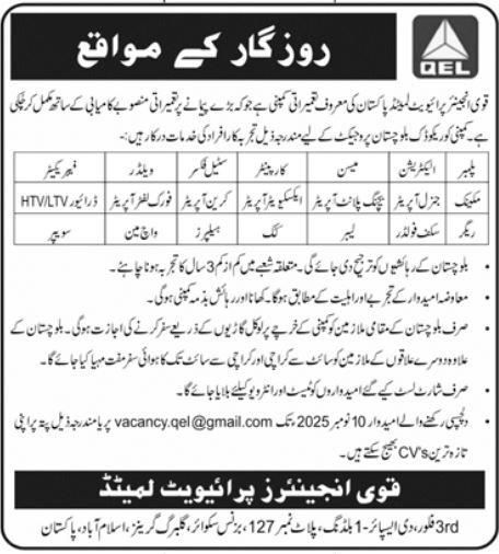Apply to Qavi Engineers Pvt Limited (QEL) Islamabad — multiple construction & site roles (HTV/LTV…