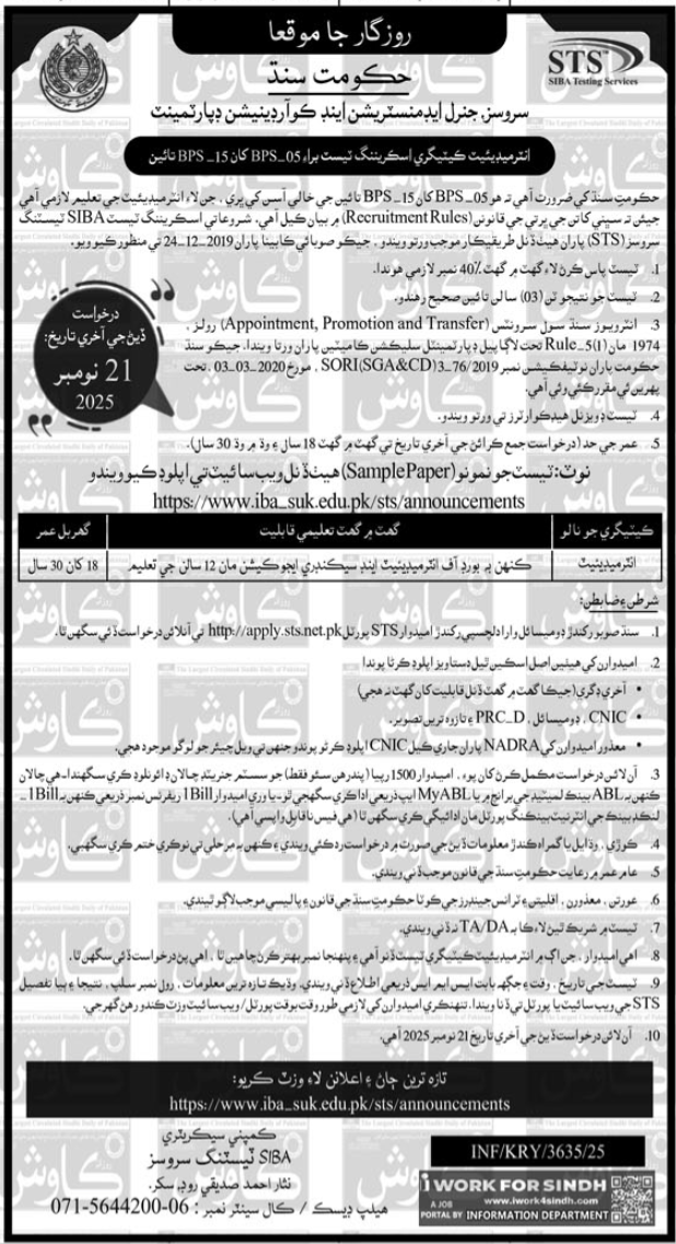 Apply for Services General Administration & Coordination Department Sukkur jobs 2025 (BPS-05 to BPS-15). Intermediate…