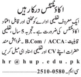 2. Email your CV and scanned documents to hr@hup.edu.pk as instructed in the job advertisement. Use a concise subject line such as “Application for Accountant / Accounts Officer – [Your Name]”. Submit your application well before the closing date to avoid last-minute issues.