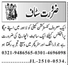 A reputed construction company in Lahore has announced vacancies for a Site Incharge for its mega projects. This role is crucial for ensuring on-site coordination, quality control and adherence to drawings and structural specifications. The vacancy was advertised in a national newspaper on 17 October 2025 and is open to candidates with Intermediate, DAE or Bachelor qualifications.